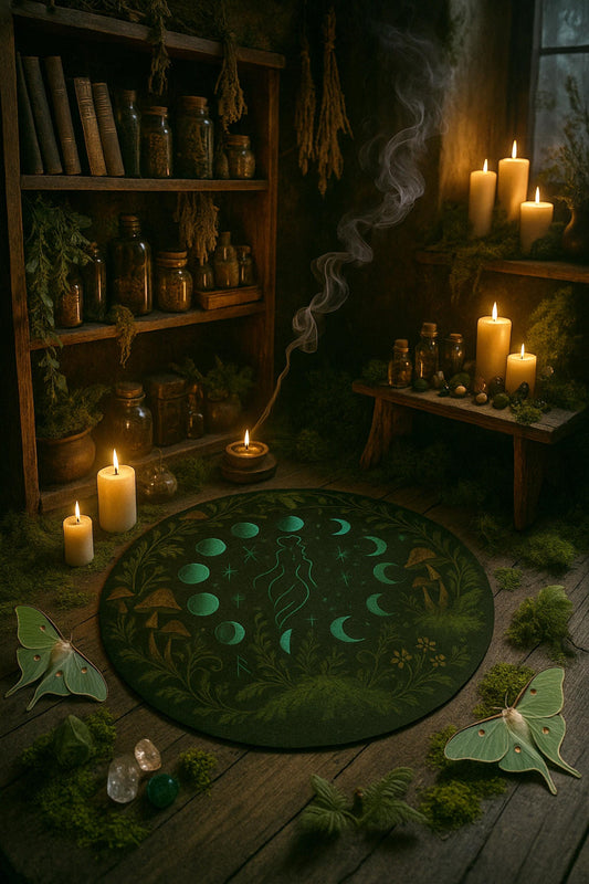 Dark Cottagecore Moon Phase Rug, Goblincore Witchy Forest Mat with Celestial Feminine Silhouette, Moss Circular Rug in Natural Earth Tones