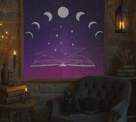 Lunar Night Woven Blanket, Reading Nook Decor, Phases of the Moon Tapestry, Witchy Cottagecore Aesthetic, Bookish Booktok Romantasy Gift