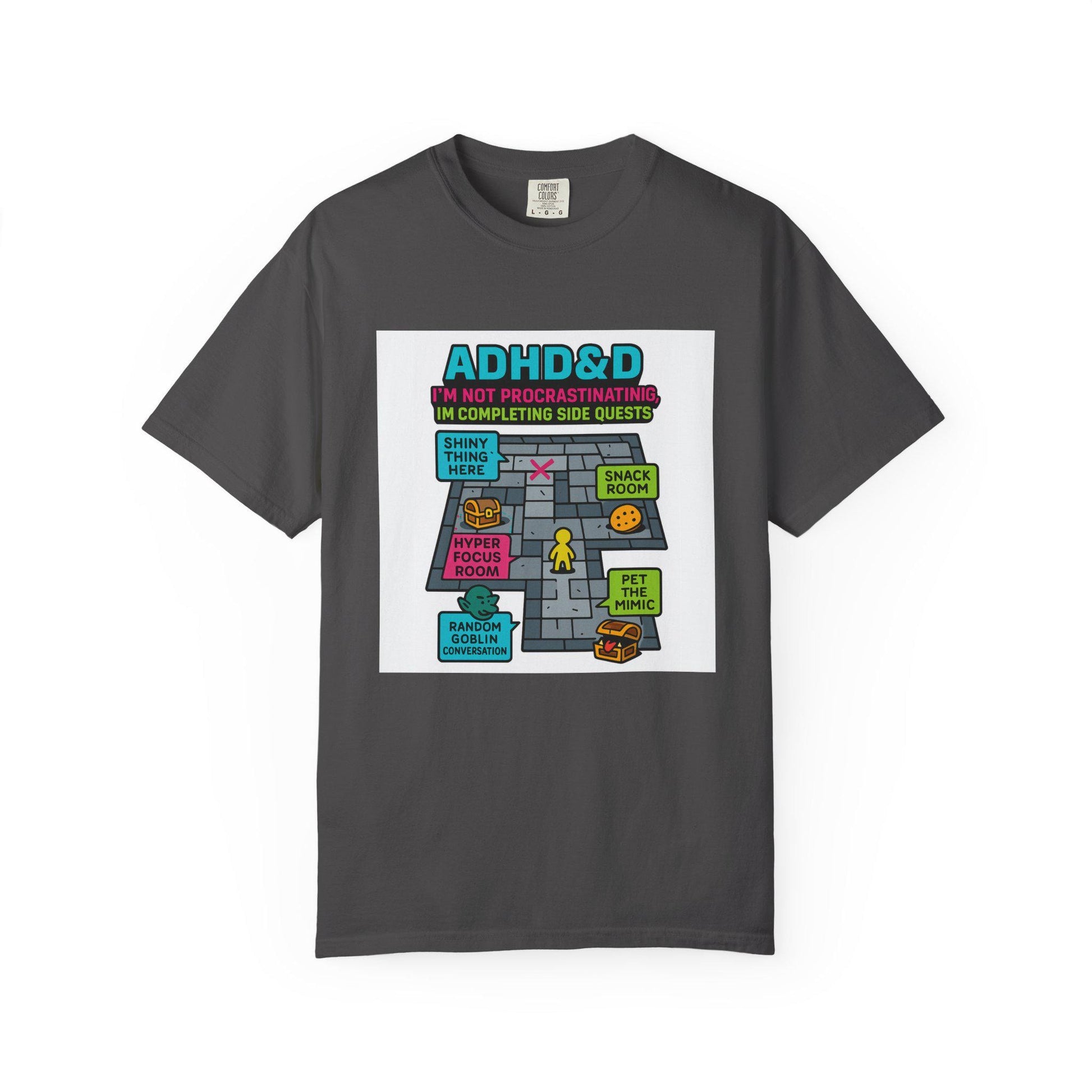 ADHD&D I'm Not Procrastinating I'm Completing Side Quests T-shirt featuring a dungeon map with plenty of distractions for the DND player with ADHD. This quirky and unique design is perfect for fans of tabletop role-playing games and those looking for a conversation starter. Suitable for adults, this garment-dyed tee is made with high-quality cotton for long-lasting comfort. Ideal for casual wear and semi-formal settings, this shirt is a must-have for any gaming enthusiast or geek.