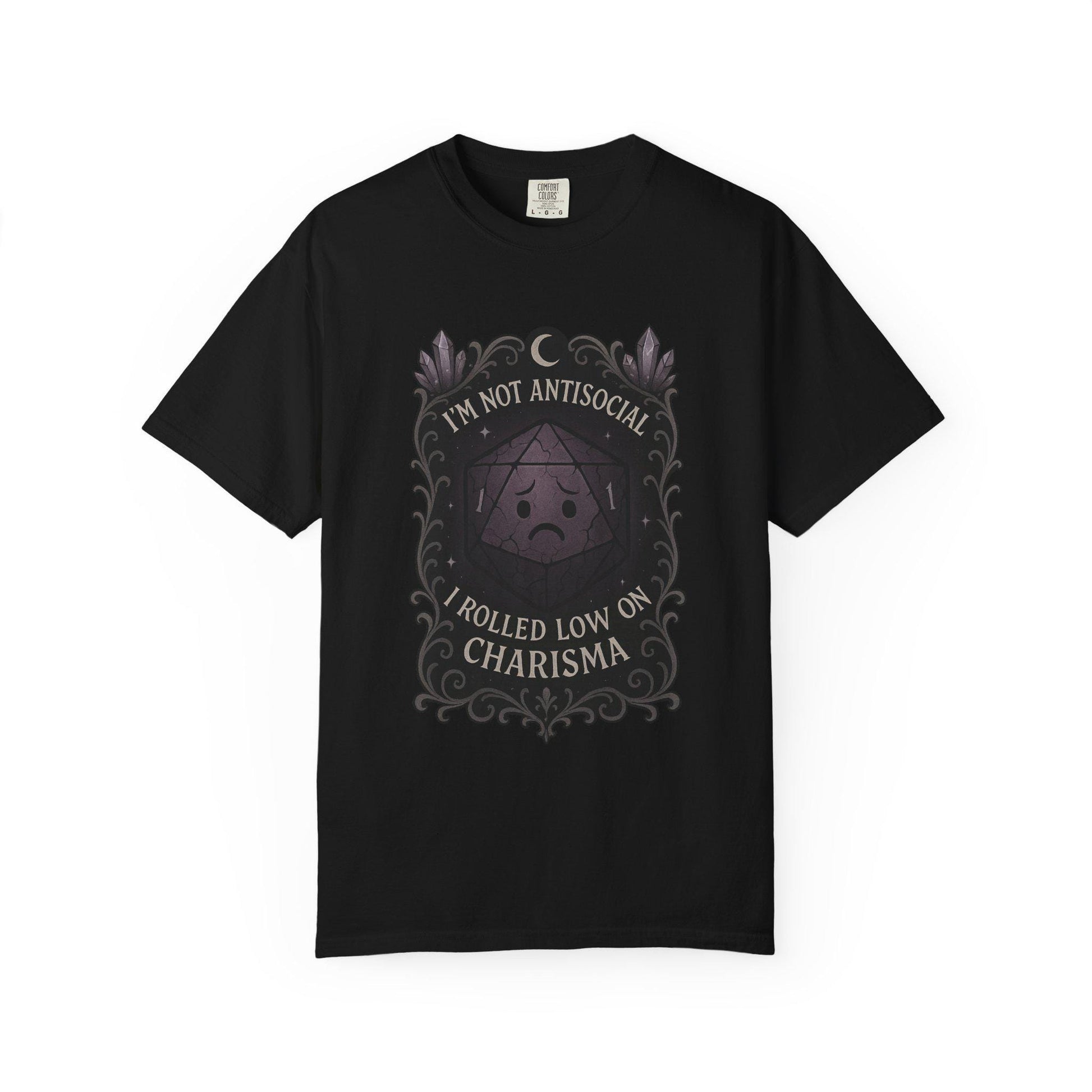 Embrace your inner emo DnD gamer with this unisex garment-dyed t-shirt featuring a graphic of a d20 with a number 1 and the text "I'm not antisocial I rolled low on charisma". Perfect for those who love Dungeons and Dragons and want to showcase their unique sense of humor. Ideal for nerdy gatherings, game nights, and casual everyday wear.