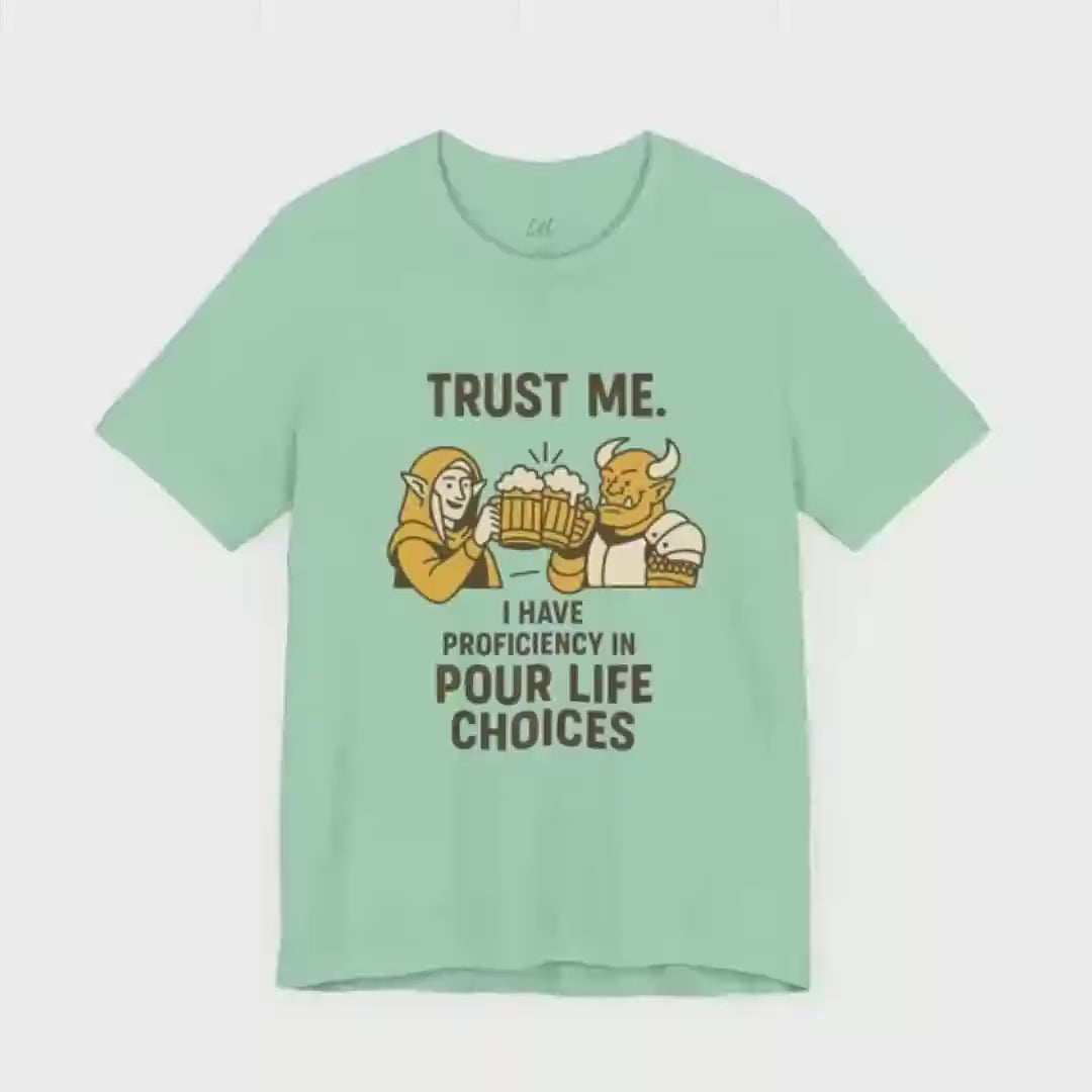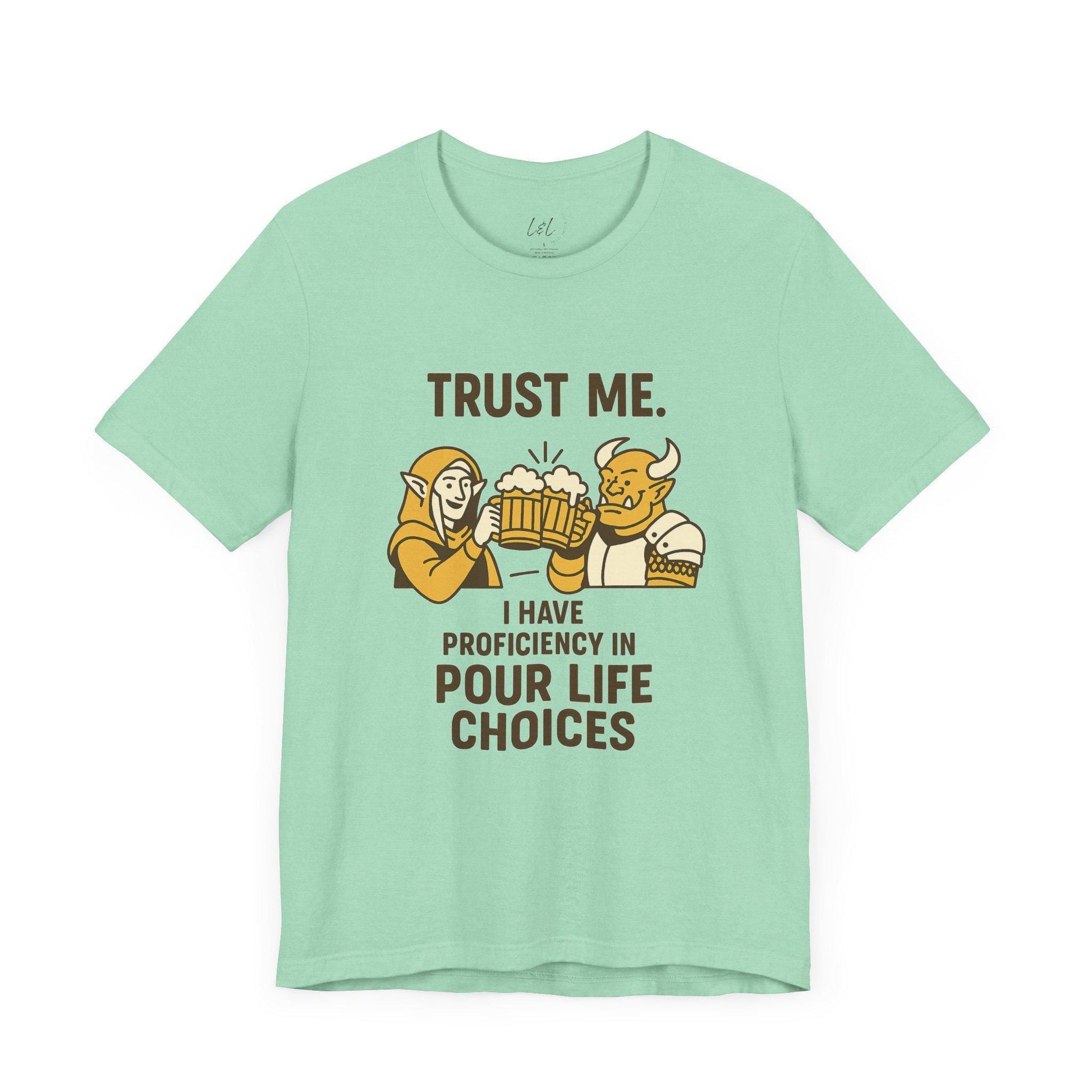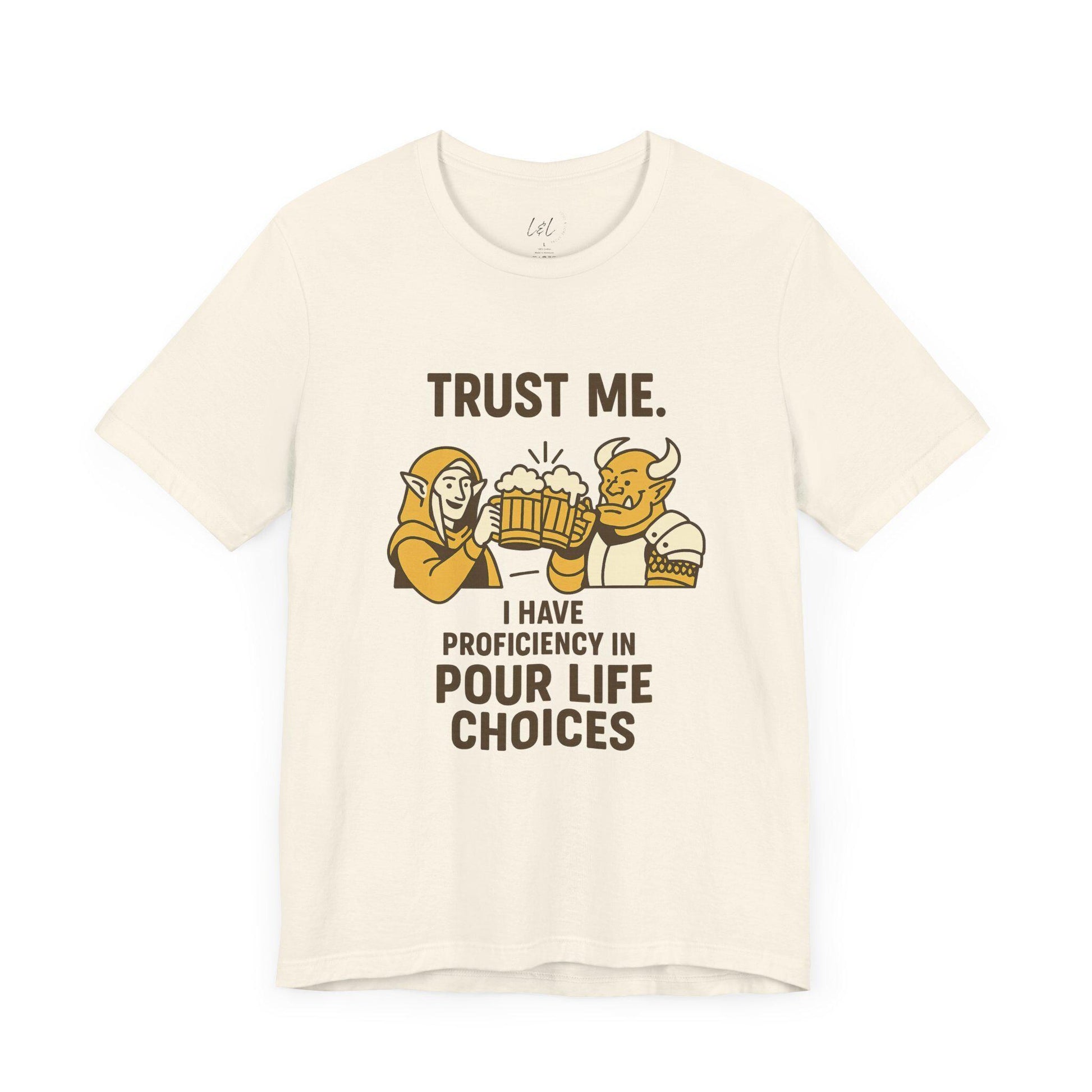Funny DND Graphic Tee, Proficiency in Pour Choices Shirt, Soft Jersey Cotton T-Shirt for Bar Crawl, Drinking Shirt, Men Women Teens, S-3XL